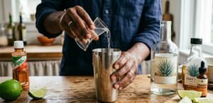 - Add tequila, lime juice, agave syrup, and orange bitters into a cocktail shaker.